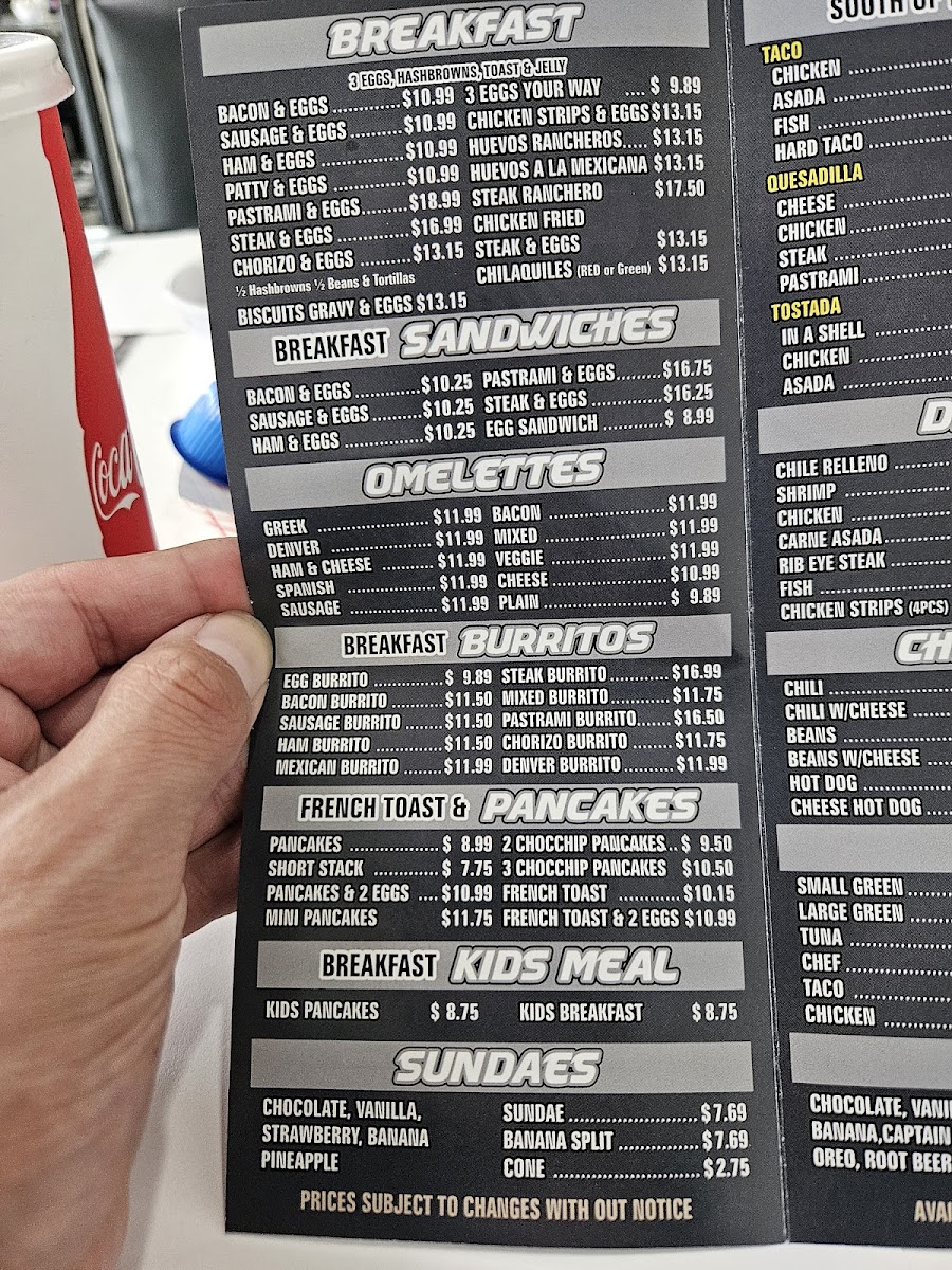 Typically includes two eggs any style on buttered warmed bread. / Dos huevos al gusto sobre pan tibio con mantequilla.